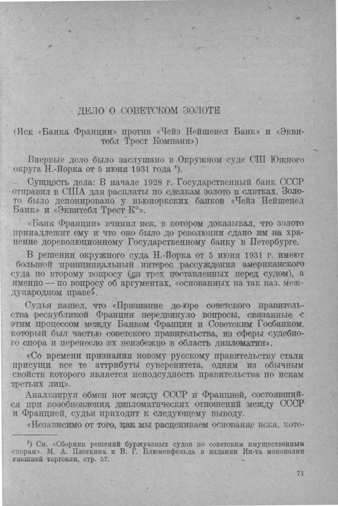 Дело о советском золоте в США. Иск «Банка Франции» против «Чейз Нейшенел Банк» и «Эквитебл Трест Компани». Окружной суд СШ Южного округа Н.-Йорка от 5 июня 1931 года.