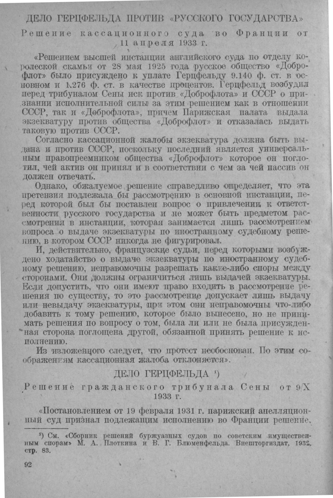 Дело Герцфельда против Русского государства. Решение кассационного суда во Франции от 11 апреля 1933 г.