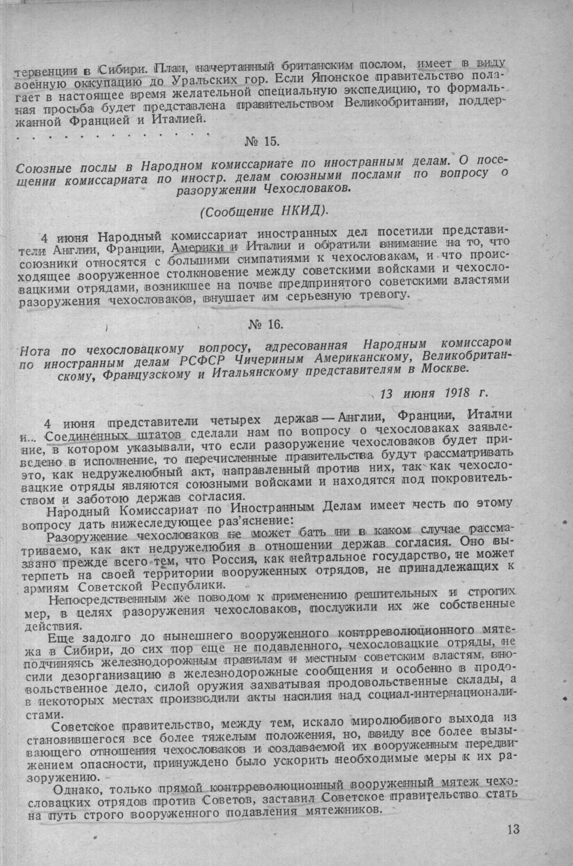 Нота по чехословацкому вопросу, адресованная Народным комиссаром по иностранным делам РСФСР Чичериным Американскому, Великобританскому, Французскому и Итальянскому представителям в Москве. 13 июня 1918 г.