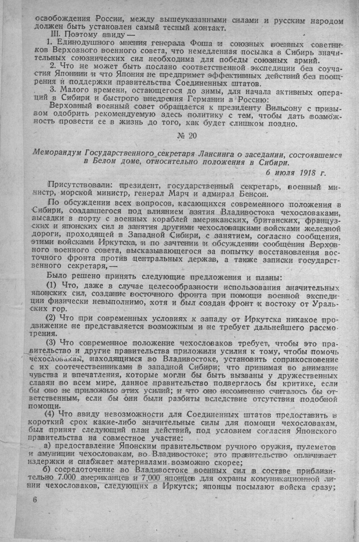 Меморандум Государственного секретаря Лансинга о заседании, состоявшемся в Белом доме, относительно положения в Сибири. 6 июля 1918 г.