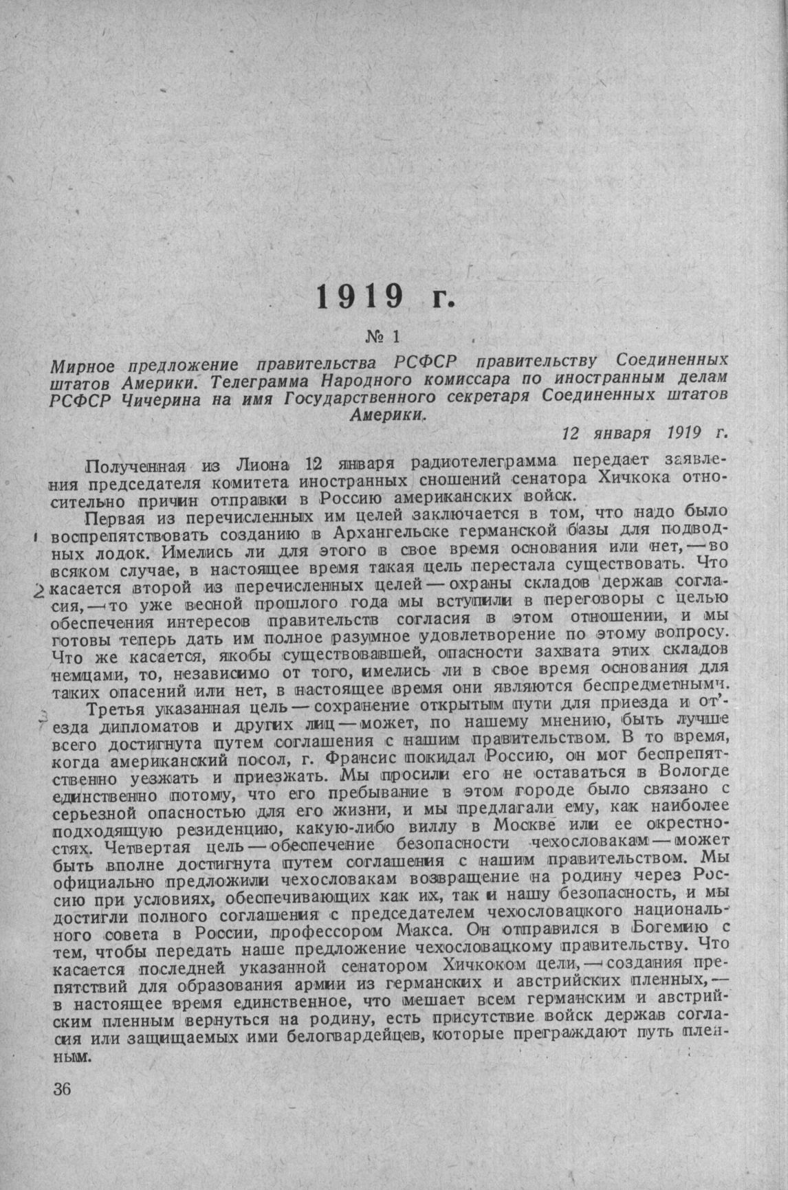 Мирное предложение правительства РСФСР правительству Соединенных штатов Америки. Телеграмма Народного комиссара по иностранным делам РСФСР Чичерина на имя Государственного секретаря Соединенных штатов Америки. 12 января 1919 г.