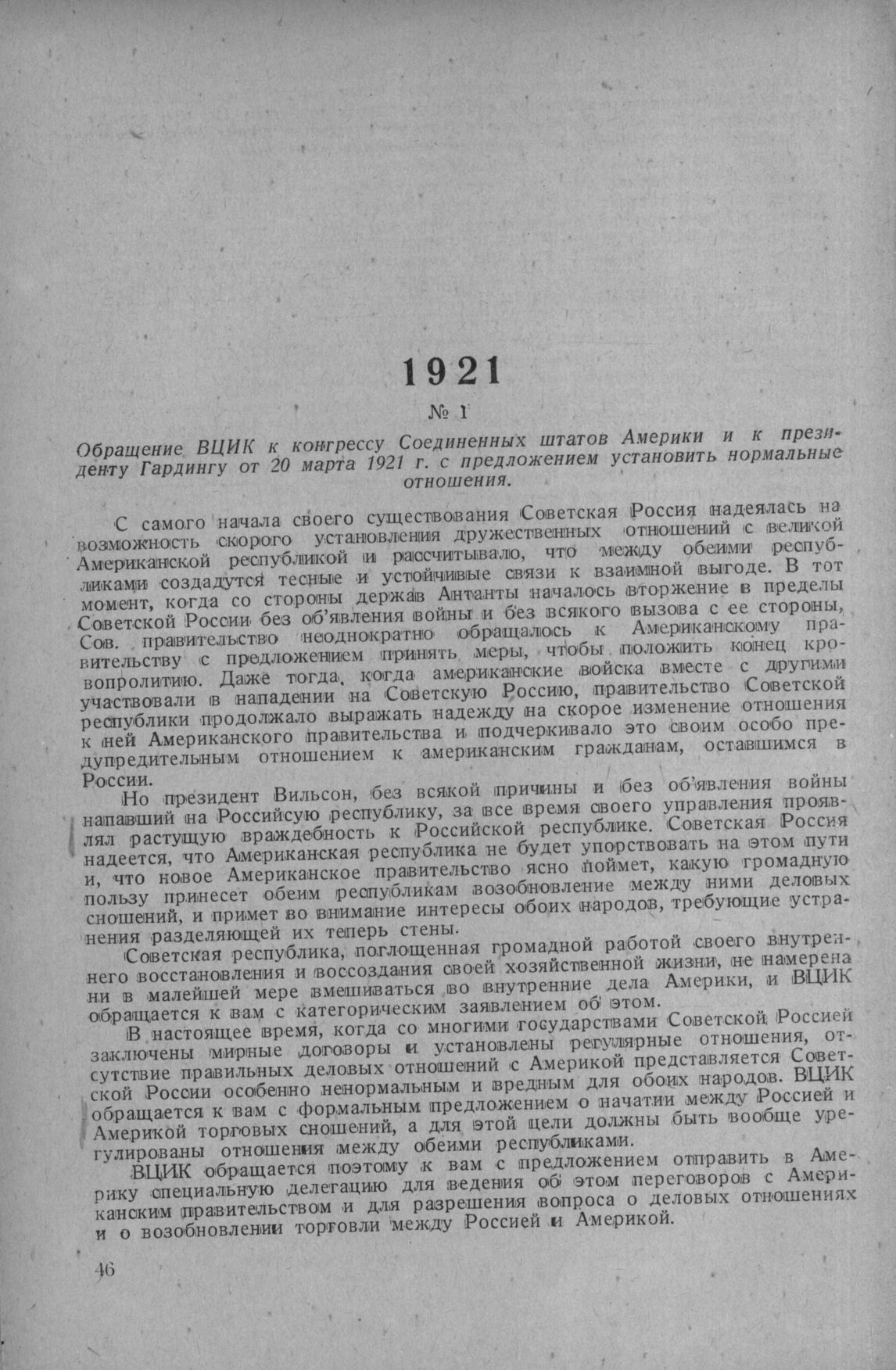 Обращение ВЦИК к конгрессу Соединенных штатов Америки и к президенту Гардингу от 20 марта 1921 г. с предложением установить нормальные отношения