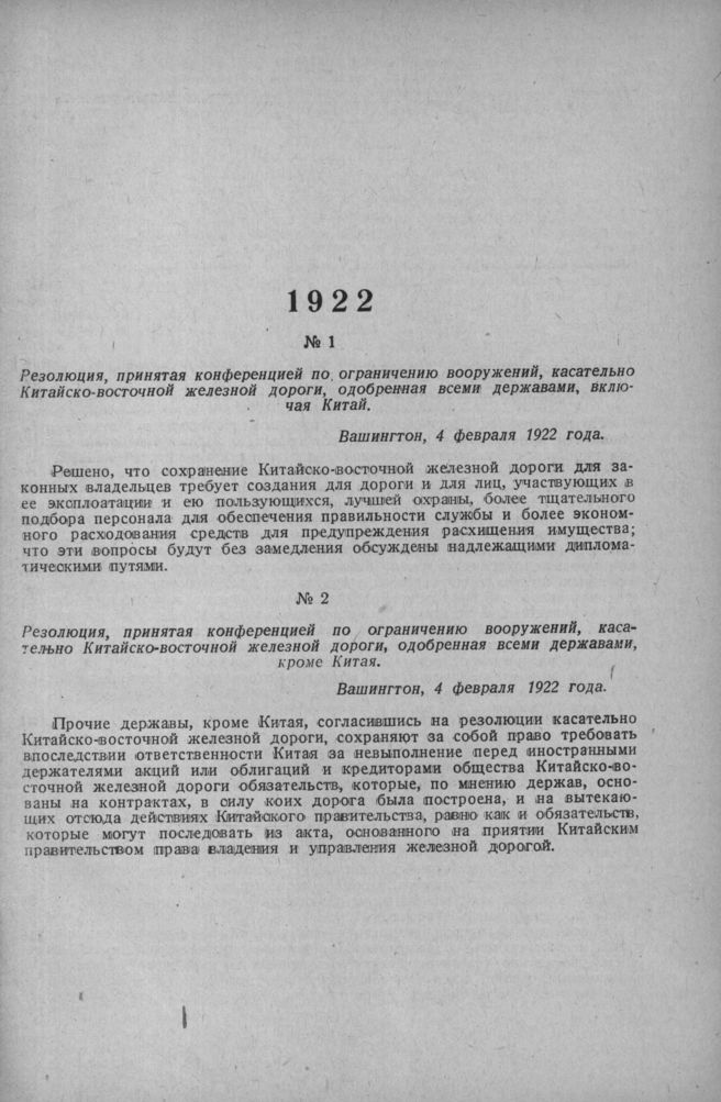 Резолюция, принятая конференцией по ограничению вооружений, касательно Китайско-восточной железной дороги, одобренная всеми державами, включая Китай. Вашингтон, 4 февраля 1922 года.
