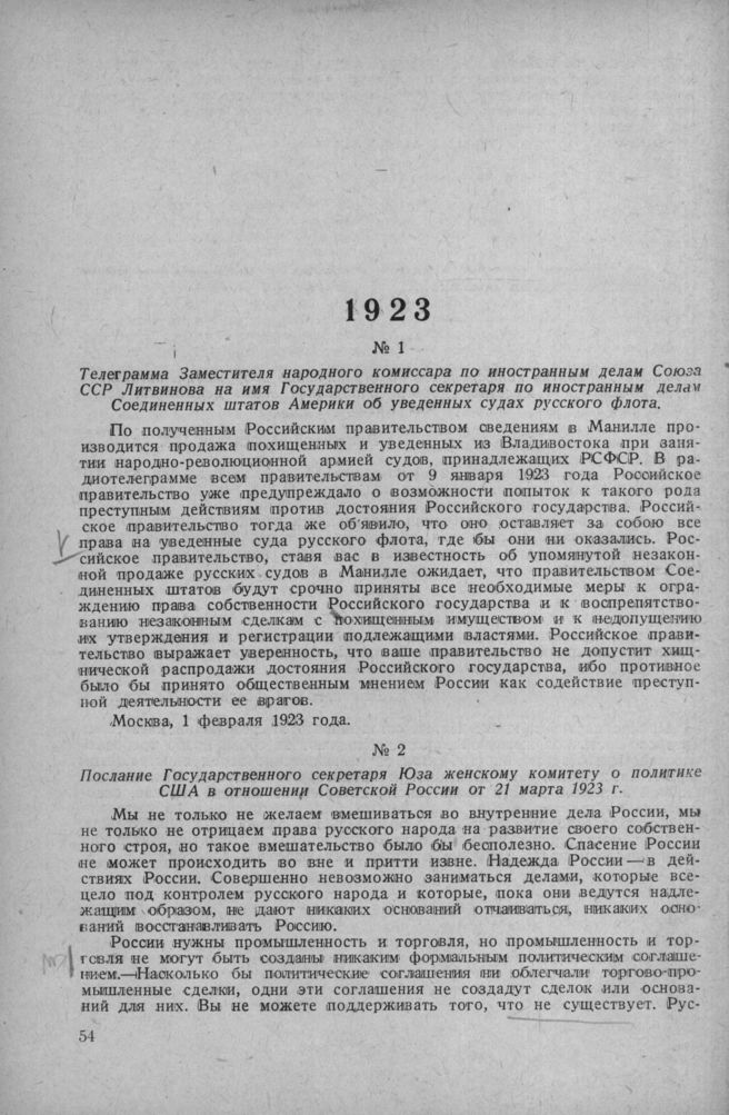 Послание Государственного секретаря Юза женскому комитету о политике США в отношении Советской России от 21 марта 1923 г.