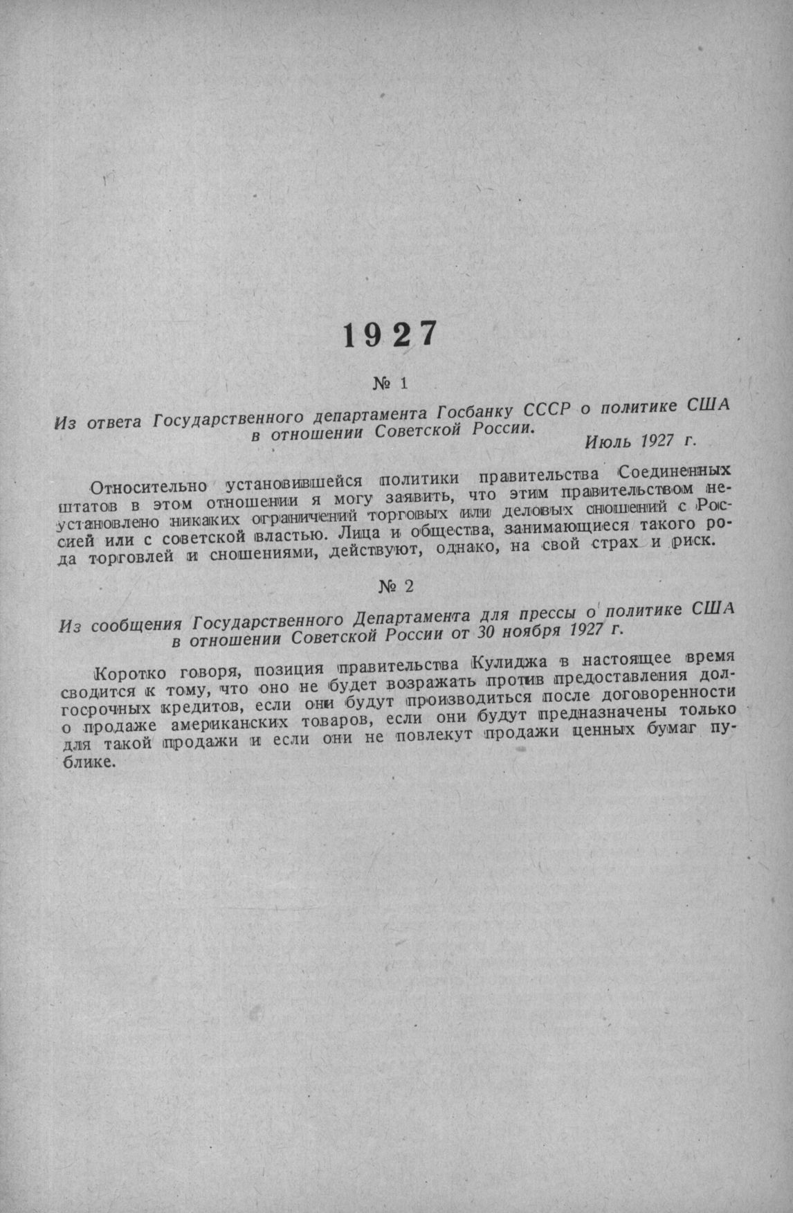 Из ответа Государственного департамента Госбанку СССР о политике США в отношении Советской России. Июль 1927 г.