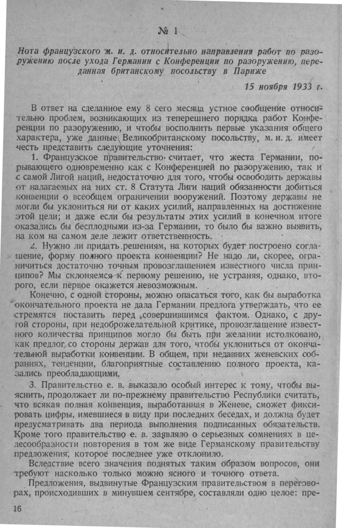Нота французского М.И.Д. относительно направления работ по разоружению после ухода Германии с Конференции по разоружению, переданная британскому посольству в Париже. 15 ноября 1933 г.