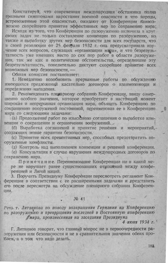 Речь т. Литвинова по поводу возвращения Германии на Конференцию по разоружению и превращения последней в Постоянную конференцию мира, произнесенная на заседании Президиума. 4 июня 1934 г.