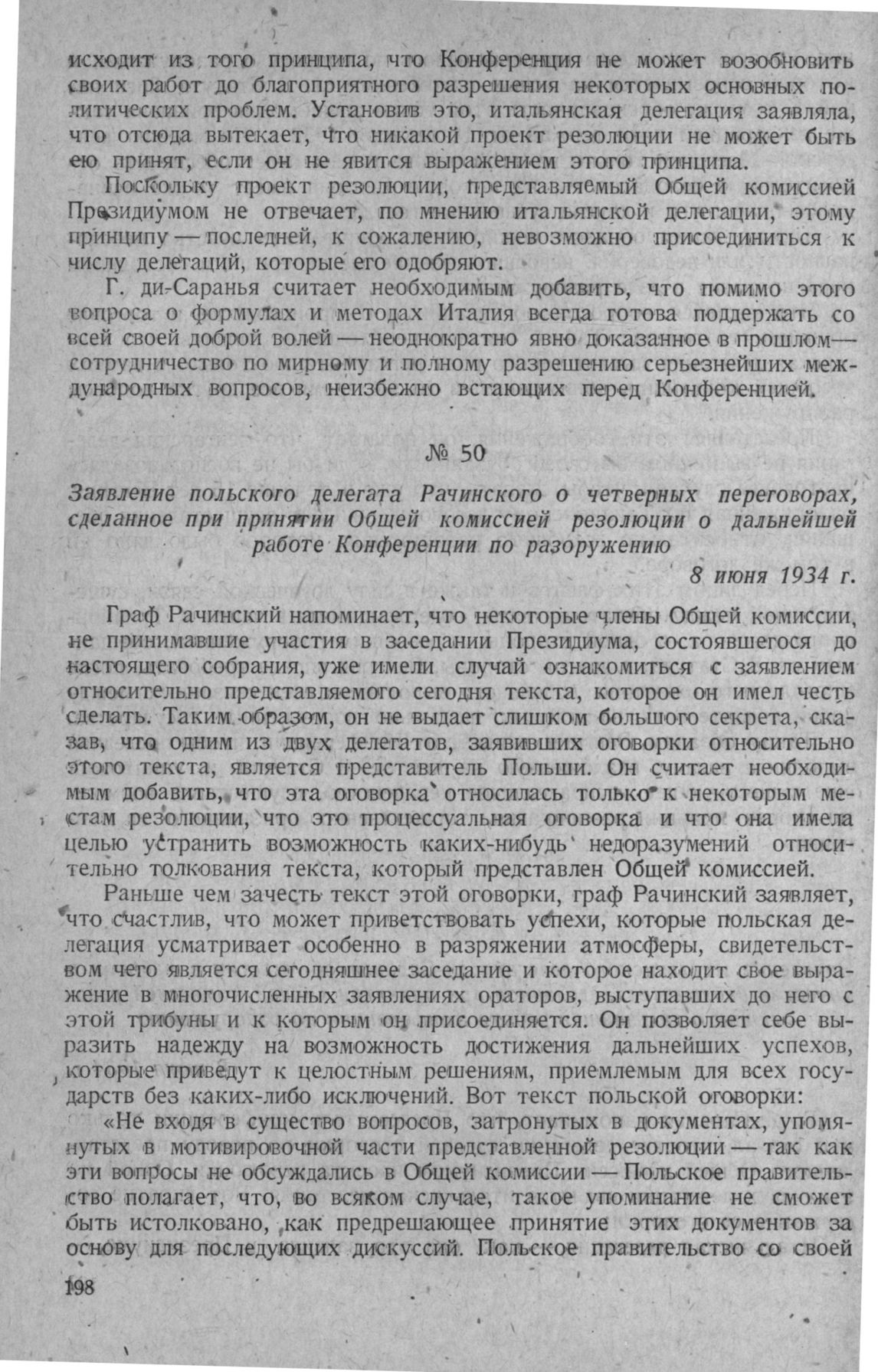 Заявление польского делегата Рачинского о четверных переговорах, сделанное при принятии Общей комиссией резолюции о дальнейшей работе Конференции по разоружению. 8 июня 1934 г.