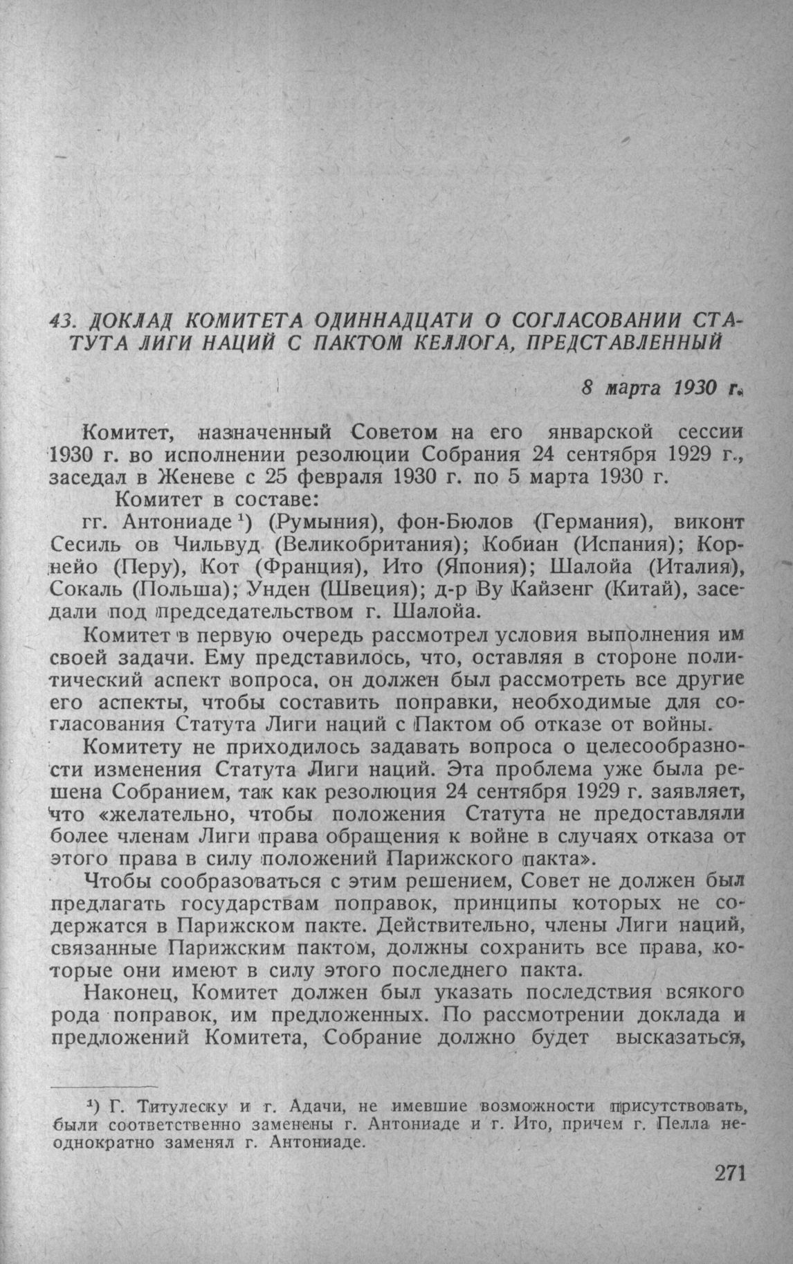 Доклад Комитета одиннадцати о согласовании Статута Лиги наций с Пактом Келлога, представленный 8 марта 1930 г.