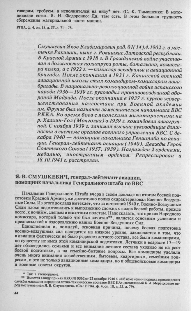Материалы совещания высшего руководящего состава РККА 23-31 декабря 1940 г. Выступления по докладу К. А. Мерецкова. Я.В. Смушкевич, генерал-лейтенант авиации, помощник начальника Генерального штаба по ВВС // РГВА, ф. 4, оп. 18, д. 55, л. 80—87.