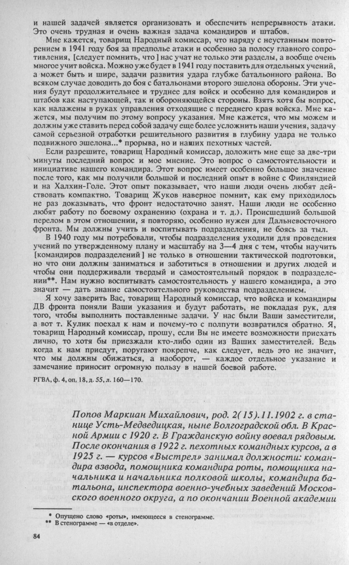 Материалы совещания высшего руководящего состава РККА 23-31 декабря 1940 г. Выступления по докладу К. А. Мерецкова. М.М. Попов, генерал-майор, командующий 1-й Краснознаменной армией Дальневосточного фронта // РГВА, ф. 4, оп. 18, д. 55, л. 171—178.