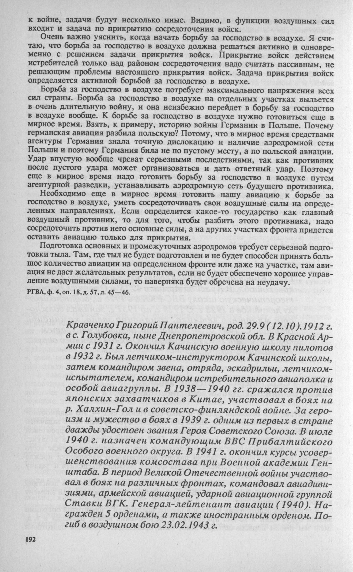 Материалы совещания высшего руководящего состава РККА 23-31 декабря 1940 г. Выступления по докладу П. В. Рычагова. Г.П. Кравченко, генерал-лейтенант авиации, командующий ВВС Прибалтийского особого военного округа // РГВА, ф. 4, oп. 18, д. 57, л. 47—50.