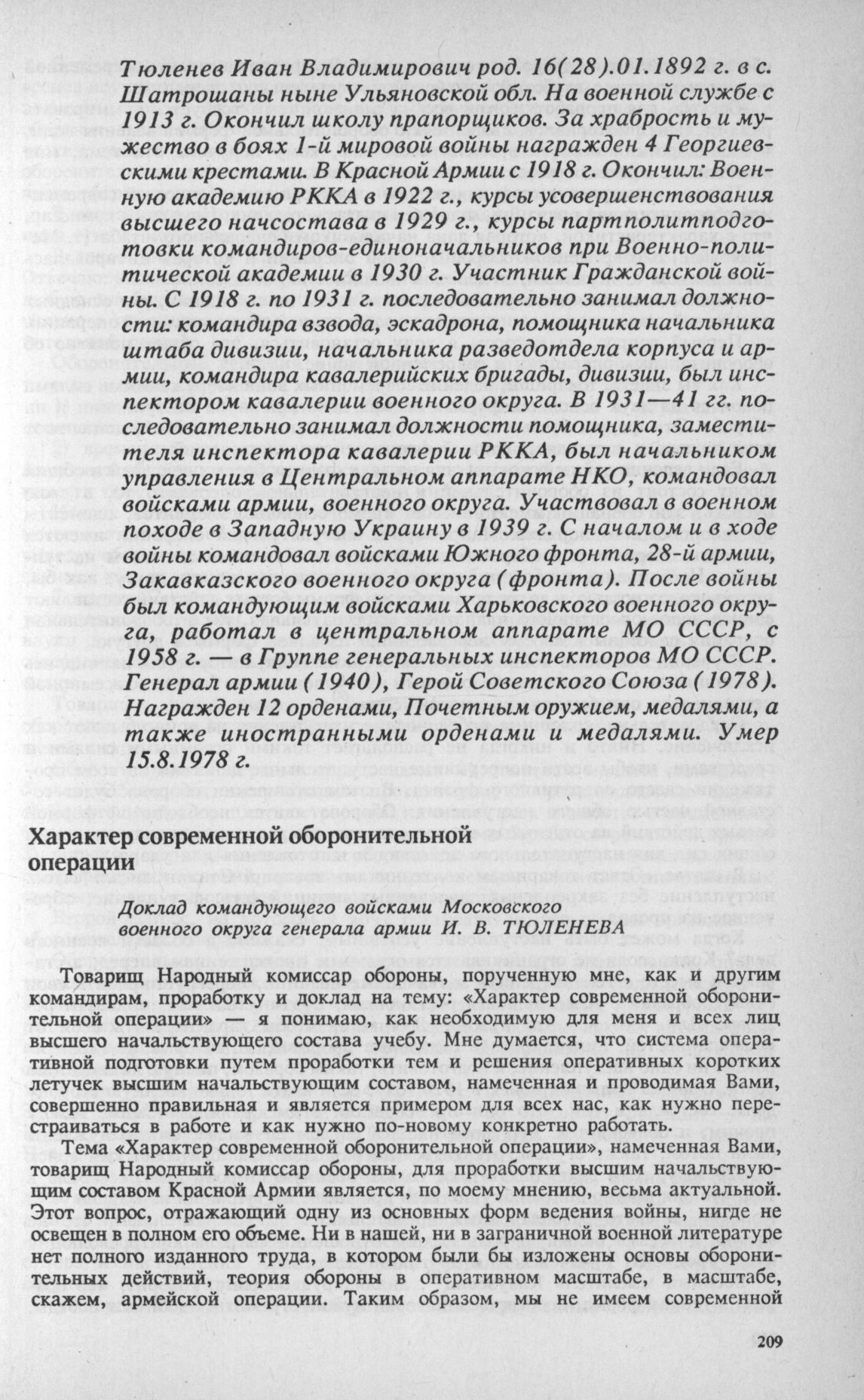 Материалы совещания высшего руководящего состава РККА 23-31 декабря 1940 г. Характер современной оборонительной операции. Доклад командующего войсками Московского военного округа генерала армии И.В. Тюленева