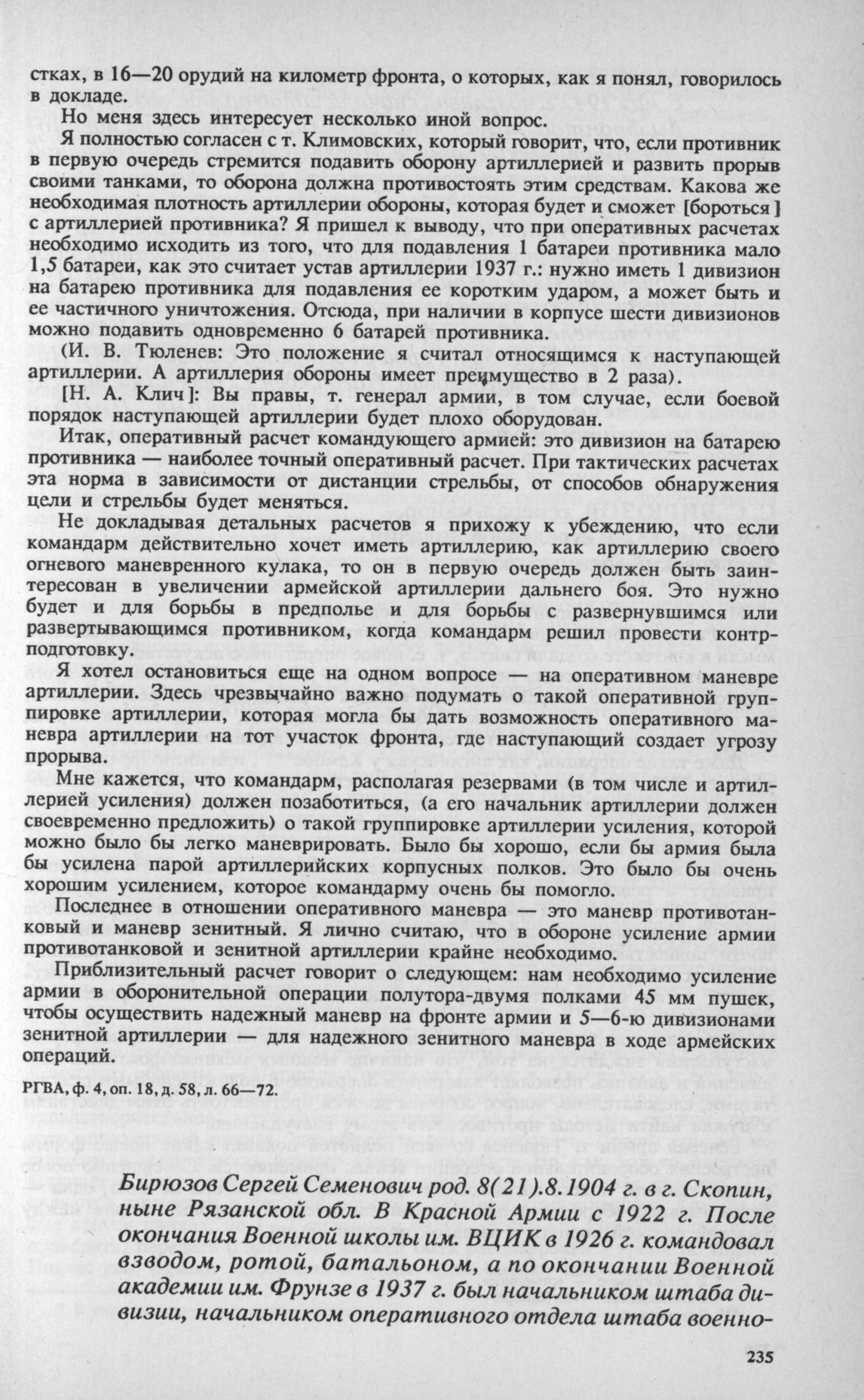 Материалы совещания высшего руководящего состава РККА 23-31 декабря 1940 г. Выступления по докладу И. В. Тюленева. С.С. Бирюзов, генерал-майор, командир 132-й стрелковой дивизии, Харьковский военный округ // РГВА, ф. 4. oп. 18, д. 58, л. 73—76.