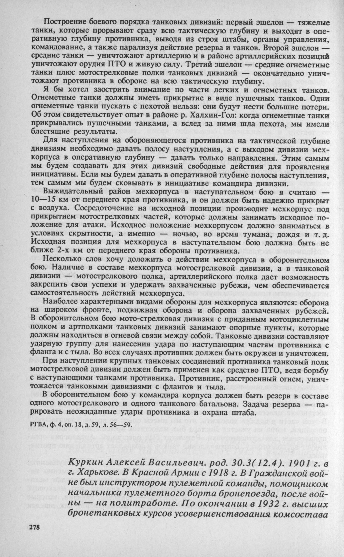 Материалы совещания высшего руководящего состава РККА 23-31 декабря 1940 г. Выступления по докладу Д. Г. Павлова. А.В. Куркин, генерал-майор танковых войск, командир 5 танковой дивизии, Прибалтийский Особый военный округ // РГВА, ф. 4, oп. 18, д. 59, л. 60—67.