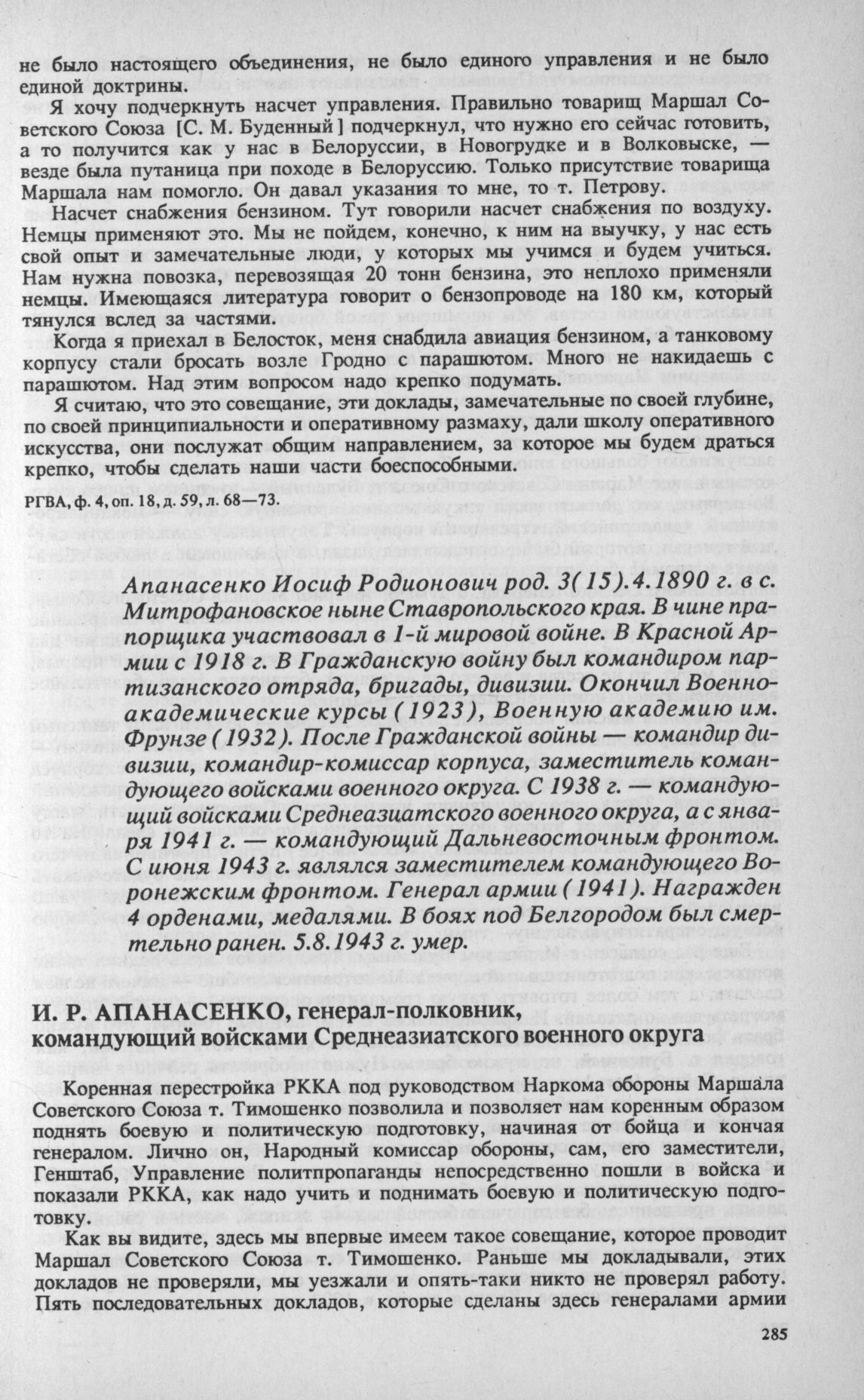Материалы совещания высшего руководящего состава РККА 23-31 декабря 1940 г. Выступления по докладу Д. Г. Павлова. И.Р. Апанасенко, генерал-полковник, командующий войсками Среднеазиатского военного округа // РГВА, ф. 4, oп. 18, д. 59, л. 74—78.