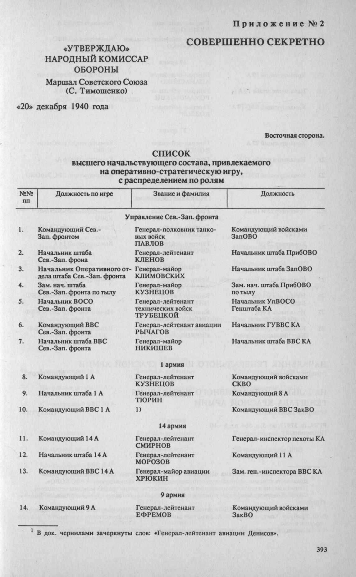 Список высшего начальствующего состава, привлекаемого на оперативно-стратегическую игру, с распределением по ролям. Восточная сторона. 20 декабря 1940 года