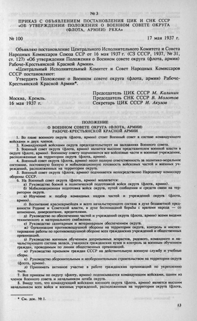 Приказ с объявлением постановления ЦИК и СНК СССР «Об утверждении Положения о Военном совете округа (флота, армии) РККА». 17 мая 1937 г. // Ф. 4, оп. 15, д. 14, л. 186. Типогр. экз.