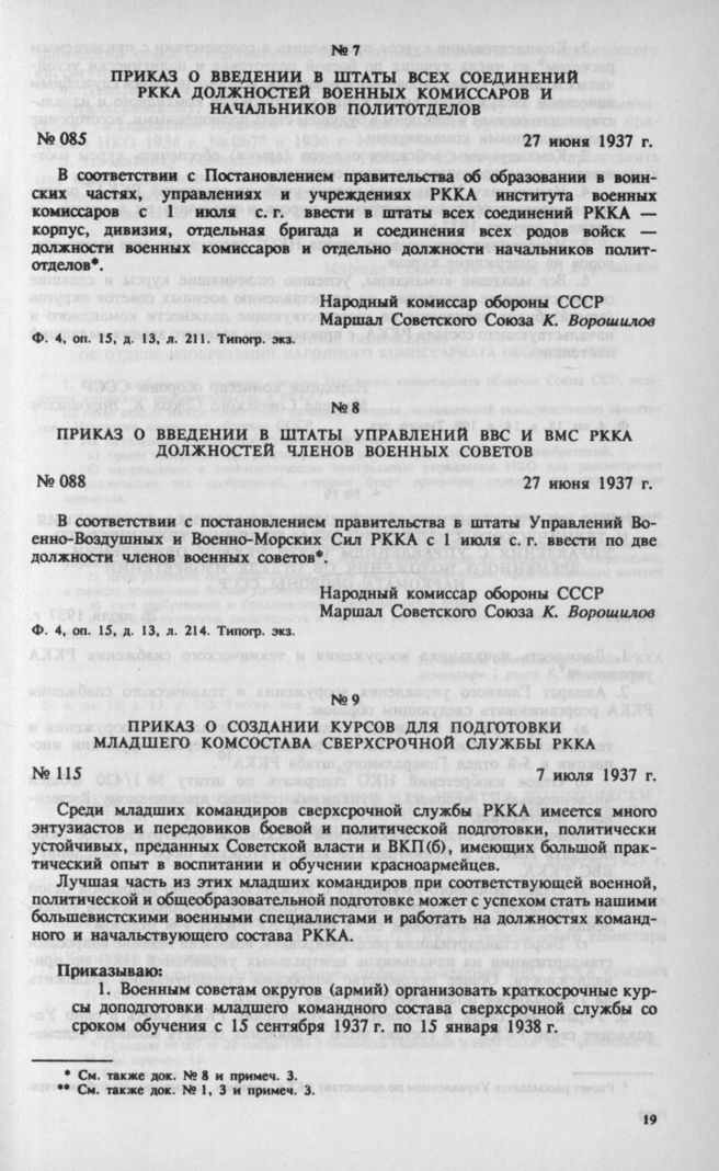 Приказ о введении в штаты Управлений ВВС и ВМС РККА должностей членов военных советов. 27 июня 1937 г. // Ф. 4, оп. 15, д. 13, л. 214. Типогр. экз.