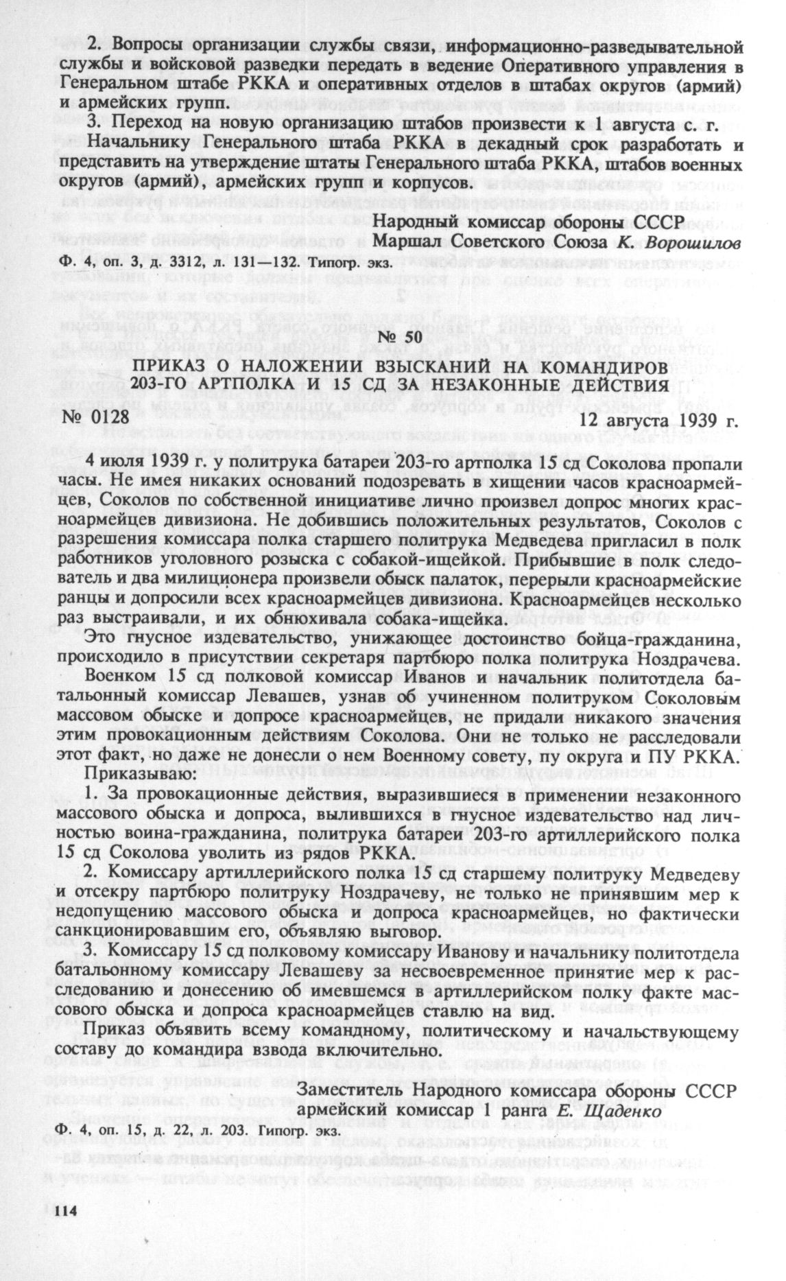 Приказ о наложении взысканий на командиров 203-го артполка и 15 сд за незаконные действия. 12 августа 1939 г. // Ф. 4, оп. 15, д. 22, л. 203. Типогр. экз.