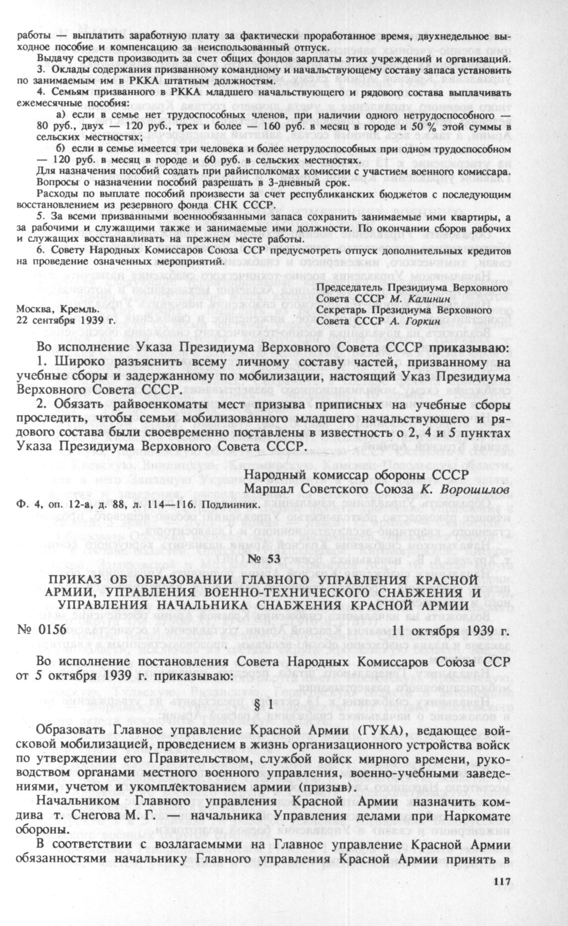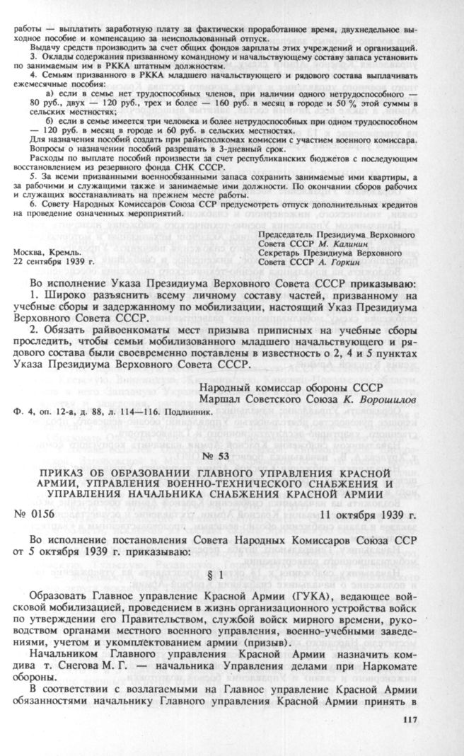 Приказ об образовании Главного управления Красной Армии, Управления военно-технического снабжения и Управления начальника снабжения Красной Армии. 11 октября 1939 г. // Ф. 4, оп. 3, д. 3312, л. 216. Типогр. экз.