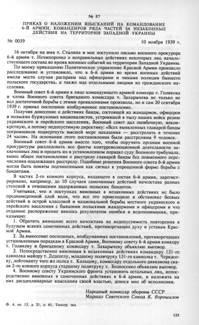 Приказ о наложении взысканий на командование 6-й армии, командиров ряда частей за незаконные действия на территории Западной Украины. 10 ноября 1939 г. / Ф. 4, оп. 15, д. 21, л. 61, Типогр. экз.