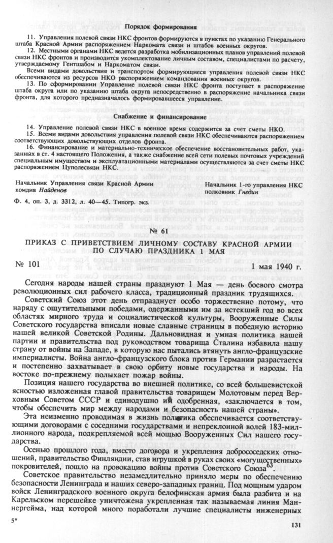 Приказ с приветствием личному составу Красной Армии по случаю праздника 1 Мая. 1 мая 1940 г. // Ф. 4, оп. 15, д. 30, л. 277. Типогр. экз.