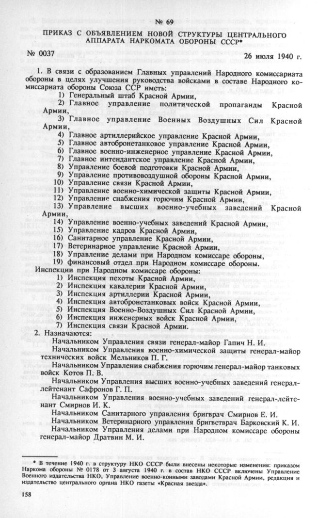 Приказ с объявлением новой структуры центрального аппарата Наркомата обороны СССР. 26 июля 1940 г.