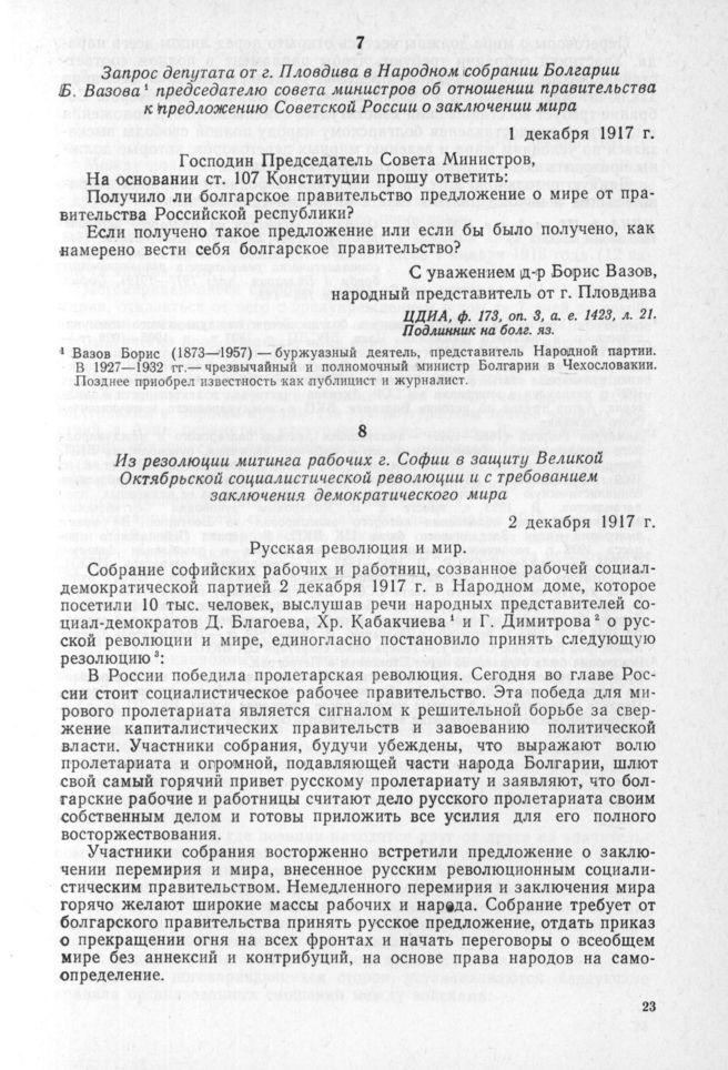 Запрос депутата от г. Пловдива в Народном собрании Болгарии Б. Вазова председателю совета министров об отношении правительства к Предложению Советской России о заключении мира 1 декабря 1917 г. // ЦДИА, ф. 173, оп. 3, а. е. 1423, л. 21. Подлинник на болг. яз.