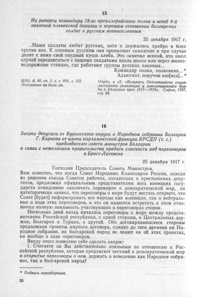Из рапорта командира 18-го артиллерийского полка в штаб 9-й пехотной плевенской дивизии о хорошем отношении болгарских солдат к русским военнопленным. 25 декабря 1917 г. // ЦВА, ф. 40, оп. 2, а. е. 959, л. 133. Подлинник на болг. яз. Опубл. в сб: «Великата Октомврийска социалистическа революция и революционните борби в България през 1917—1919». София, 1957, стр. 84.