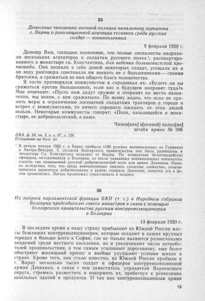Донесение чиновника военной полиции начальнику гарнизона г. Варны о революционной агитации тесняков среди русских солдат — военнопленных. 8 февраля 1920 г. // ЦВА, ф. 24, оп. 3, а. е. 87, л. 128. Подлинник на болг. яз.