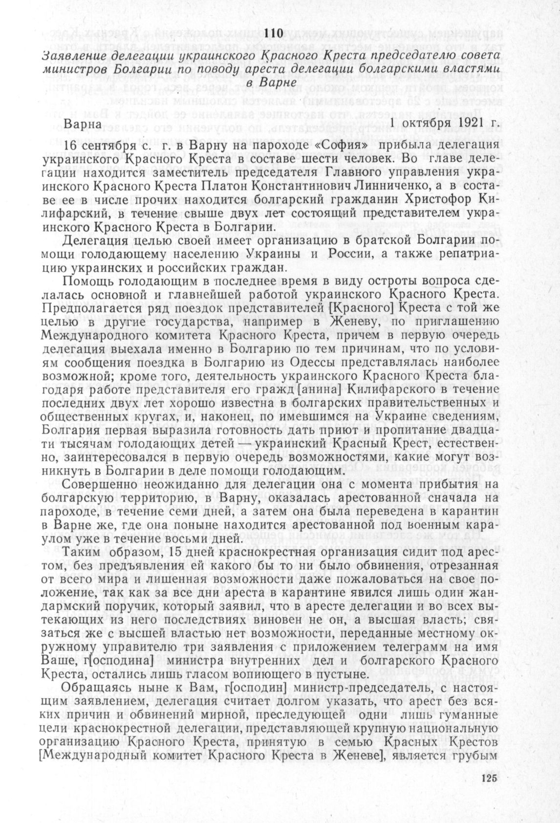 Заявление делегации украинского Красного Креста председателю совета министров Болгарии по поводу ареста делегации болгарскими властями в Варне. Варна. 1 октября 1921 г. // Печат. по: ЦДИА, ф. АМВнР. Подлинник.