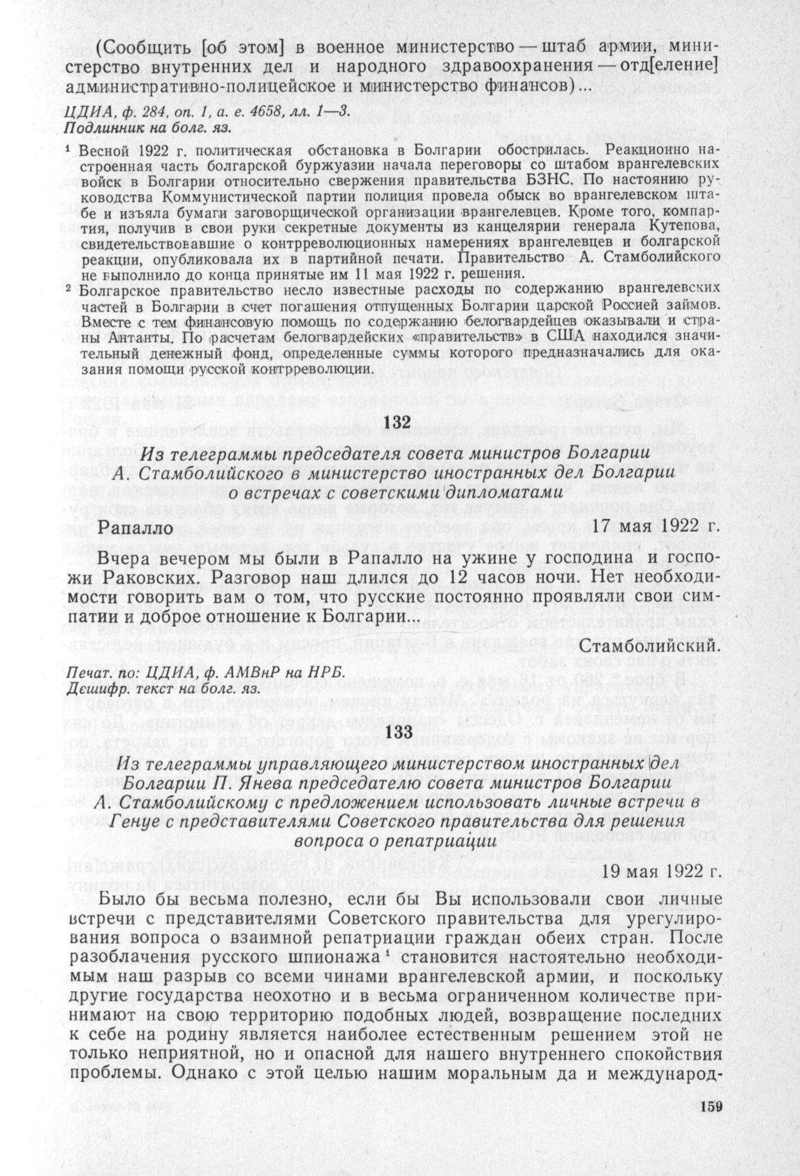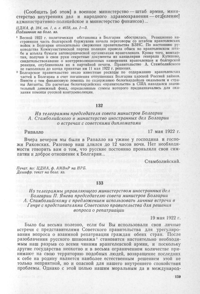 Из телеграммы управляющего министерством иностранных дел Болгарии П. Янева председателю совета министров Болгарии А. Стамболийскому с предложением использовать личные встречи в Генуе с представителями Советского правительства для решения вопроса о репатриации. 19 мая 1922 г. // Печат. по: ЦДИА, ф. АМВнР. Дешифр. текст на болг. яз.