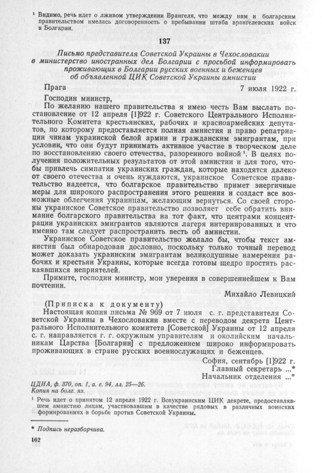 Письмо представителя Советской Украины в Чехословакии в министерство иностранных дел Болгарии с просьбой информировать проживающих в Болгарии русских военных и беженцев об объявленной ЦИК Советской Украины амнистии. Прага. 7 июля 1922 г. // ЦДИА, ф. 370, оп. 1, а. е. 94, лл. 25—26. Копия на болг. яз.