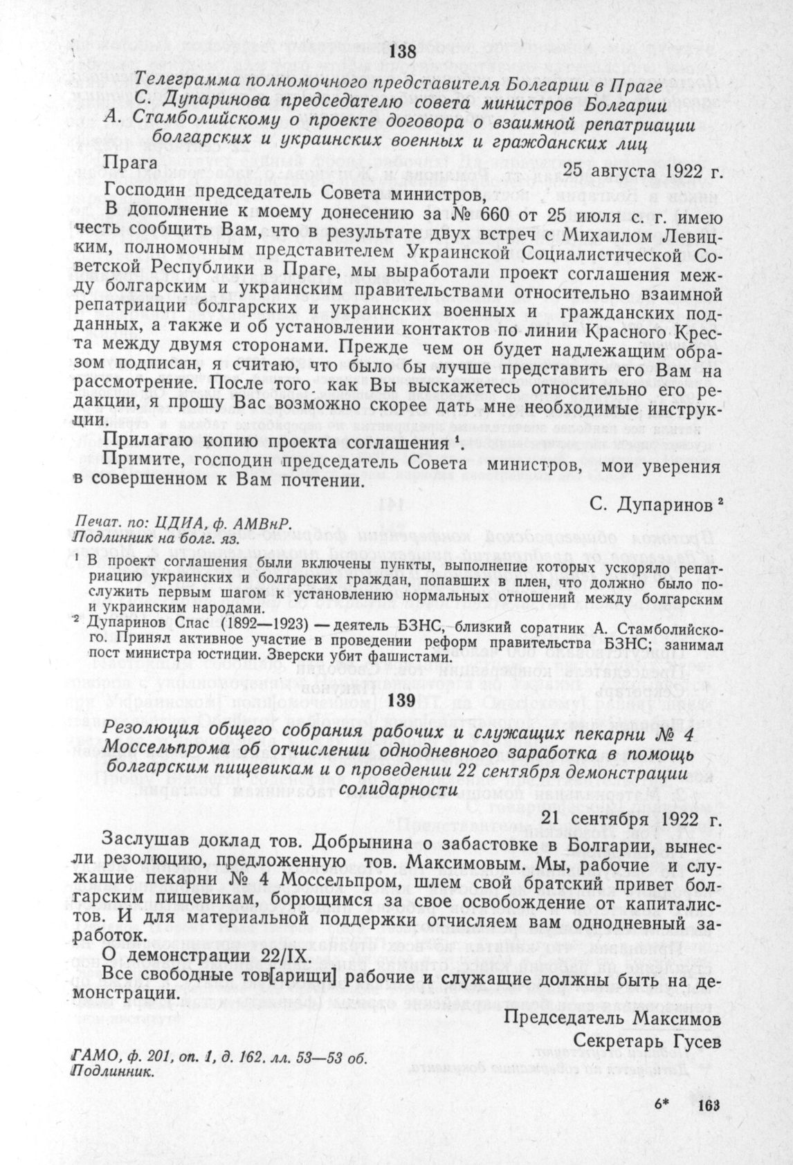 Резолюция общего собрания рабочих и служащих пекарни № 4 Моссельпрома об отчислении однодневного заработка в помощь болгарским пищевикам и о проведении 22 сентября демонстрации солидарности. 21 сентября 1922 г. // ГАМО, ф. 201, оп. 1, д. 162. лл. 53—53 об. Подлинник.
