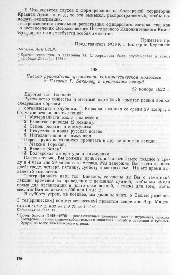 Письмо руководства организации коммунистической молодежи г. Плевена Г. Бакалову о проведении лекций. 22 ноября 1922 г. // ЦГАЛИ СССР, ф. 1033, оп. 1, д. 29, лл. 1—1 об. Подлинник на болг. яз.
