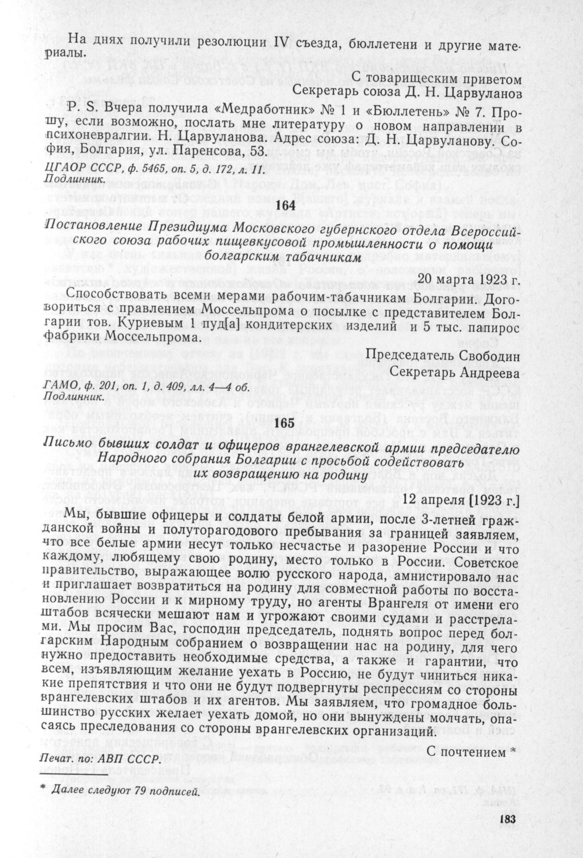 Постановление Президиума Московского губернского отдела Всероссийского союза рабочих пищевкусовой промышленности о помощи болгарским табачникам. 20 марта 1923 г. // ГАМО, ф. 201, оп. 1, д. 409, лл. 4—4 об. Подлинник.