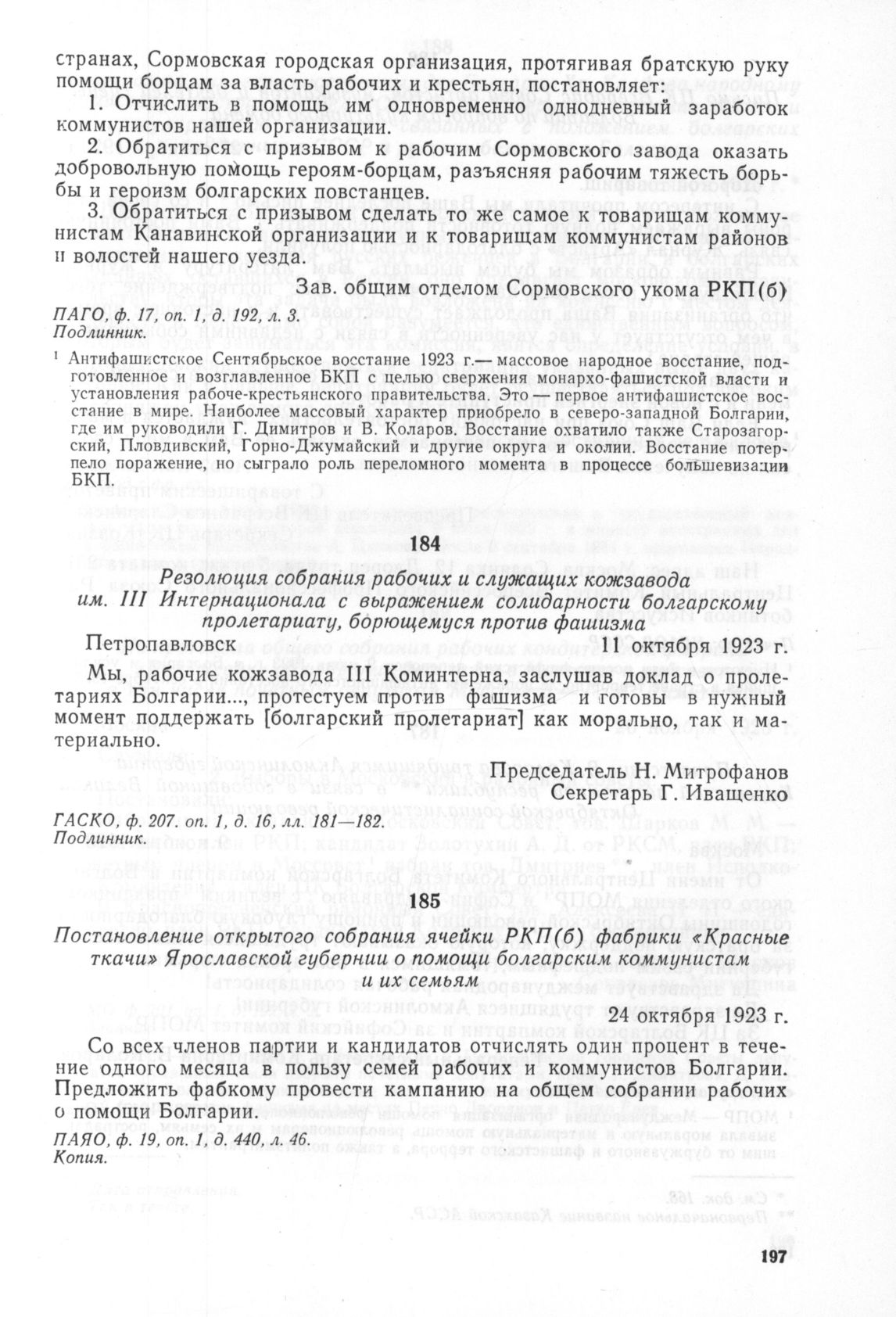 Постановление открытого собрания ячейки РКП(б) фабрики «Красные ткачи» Ярославской губернии о помощи болгарским коммунистам и их семьям. 24 октября 1923 г. // ПАЯО, ф. 19, оп. 1, д. 440, л. 46. Копия.