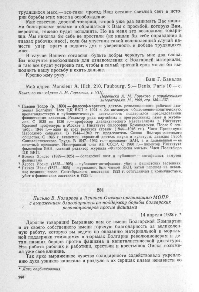 Письмо В. Коларова в Ленинск-Омскую организацию МОПР о выражением благодарности за поддержку борьбы болгарских революционеров против фашизма. 14 апреля 1928 г. // «Рабочий путь», 14 апреля 1928 г.