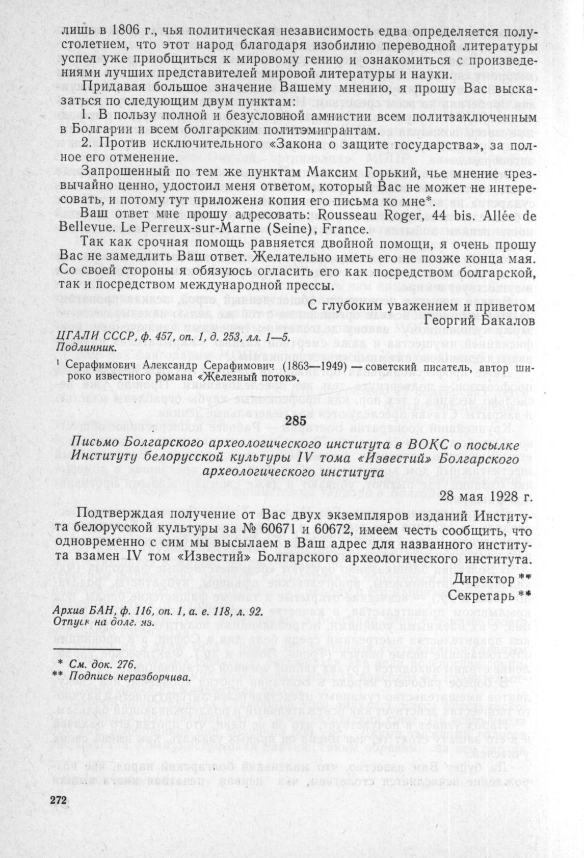 Письмо Болгарского археологического института в ВОКС о посылке Институту белорусской культуры IV тома «Известий» Болгарского археологического института. 28 мая 1928 г. // Архив БАН, ф. 116, оп. 1, а. е. 118, л. 92. Отпуск на болг. яз.