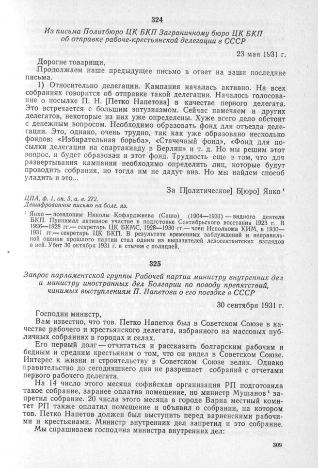 Запрос парламентской группы Рабочей партии министру внутренних дел и министру иностранных дел Болгарии по поводу препятствий, чинимых выступлениям П. Напетова о его поездке в СССР. 30 сентября 1931 г. // ЦДИА, ф. 173, оп. 5, а. е. 502, л. 20. Подлинник на болг. яз.