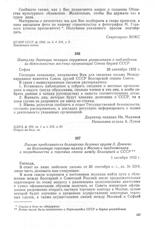 Циркуляр дирекции полиции окружным управлениям о наблюдении за деятельностью местных организаций Союза друзей СССР. София. 28 сентября 1932 г. // ЦДИА, ф. 370, оп. 1, а. е. 312, л. 60. Отпуск на болг. яз.