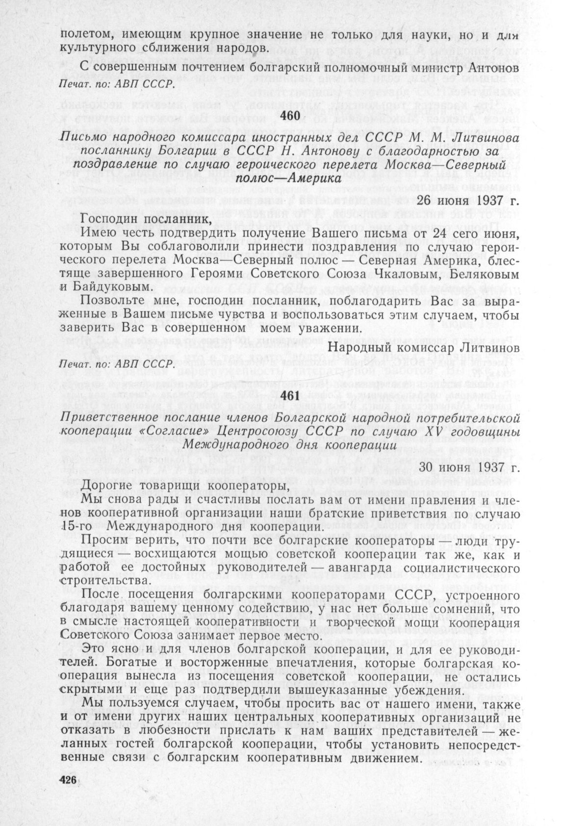 Письмо народного комиссара иностранных дел СССР М.М. Литвинова посланнику Болгарии в СССР Н. Антонову с благодарностью за поздравление по случаю героического перелета Москва— Северный полюс—Америка. 26 июня 1937 г. // Печат. по: АВП СССР.