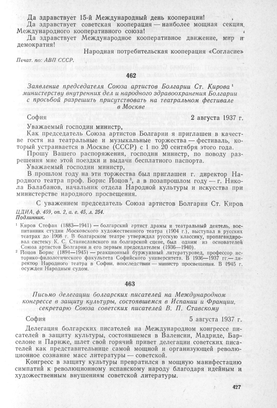 Письмо делегации болгарских писателей на Международном конгрессе в защиту культуры, состоявшемся в Испании и Франции, секретарю Союза советских писателей В.П. Ставскому. София. 5 августа 1937 г. // ЦГАЛИ СССР, ф. 631, оп. 11, д. 489, л. 18. Копия. Опубл. в кн.: «Развитие зарубежных славянских литератур в XX в.». М., 1964, стр. 382—383.