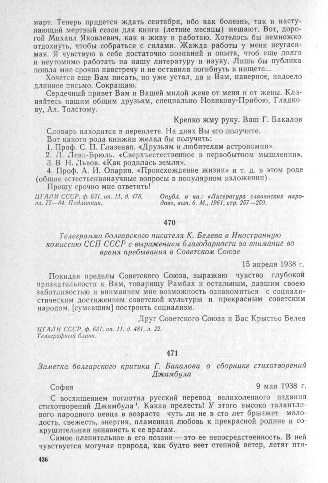 Заметка болгарского критика Г. Бакалова о сборнике стихотворений Джамбула. София. 9 мая 1938 г. // ЦГАЛИ СССР, ф. 631, оп. 11, д. 478, л. 109. Копия. Опубл. в кн.: «Литература славянских народов», вып. 6. М., 1964, стр. 260—261.