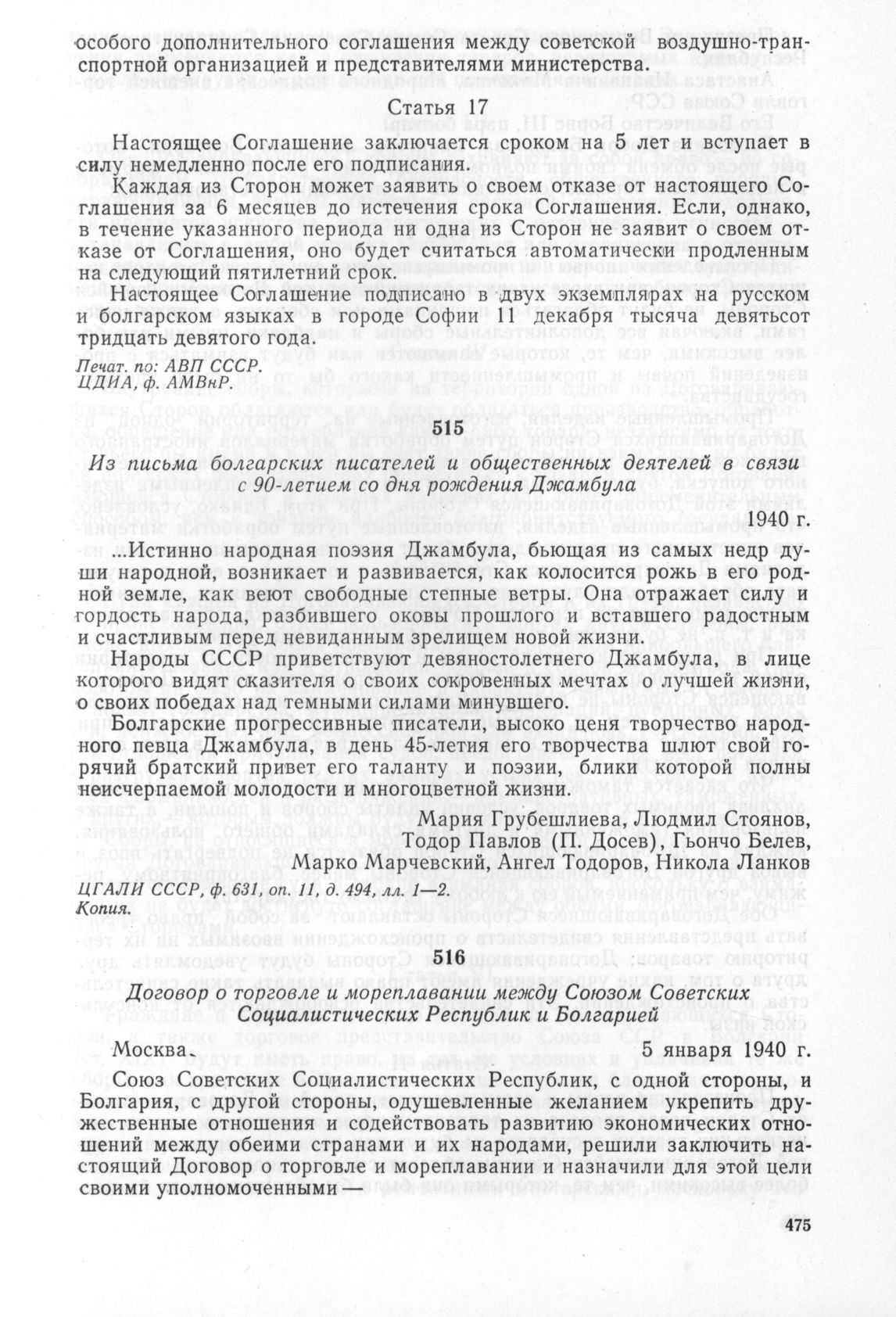 Договор о торговле и мореплавании между Союзом Советских Социалистических Республик и Болгарией. Москва. 5 января 1940 г. // ЦДИА, ф. АМВнР. Печат. по: «Сборнику торговых договоров, конвенций и соглашений СССР, заключенных с иностранными государствами до 1 января 1941 г.». М., 1941, стр. 14—27.