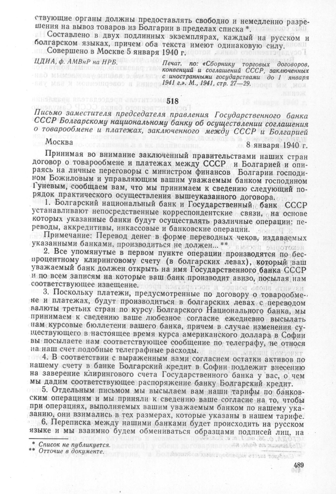 Письмо заместителя председателя правления Государственного банка СССР Болгарскому национальному банку об осуществлении соглашения о товарообмене и платежах, заключенного между СССР и Болгарией. Москва. 8 января 1940 г. // ЦДИА, ф. 285, оп. 4, а. е. 210, лл. 58, 59. Подлинник на болг. яз.