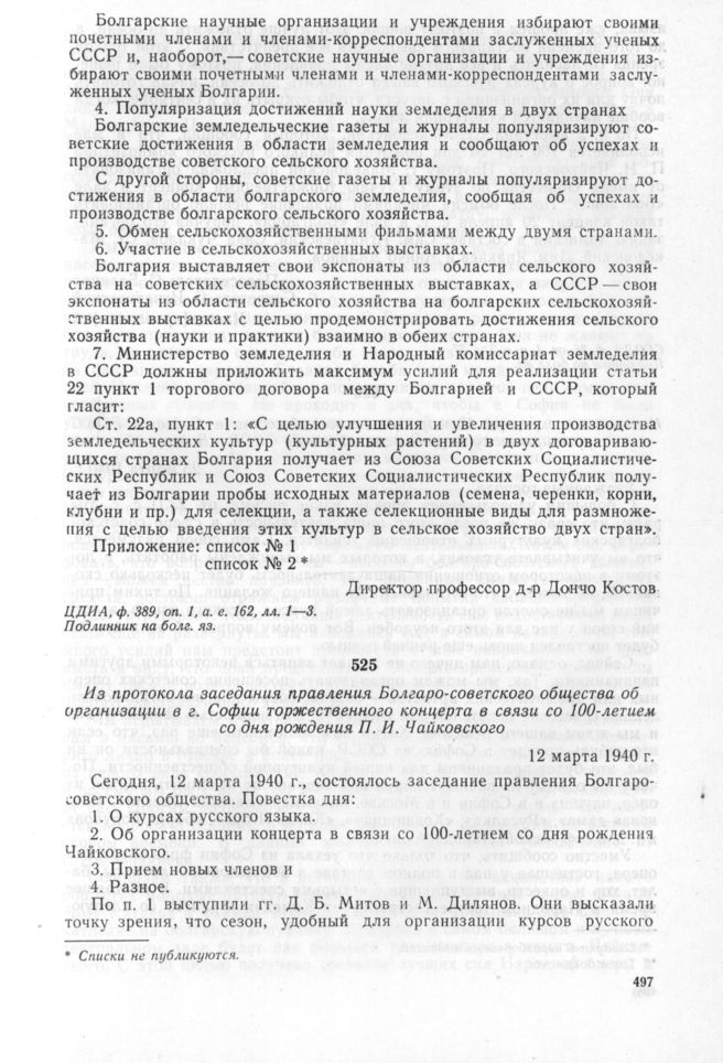 Из протокола заседания правления Болгаро-советского общества об организации в г. Софии торжественного концерта в связи со 100-летием со дня рождения П.И. Чайковского. 12 марта 1940 г. // СГОДА, ф. 36, оп. 1, а. е. 2, л. 37. Подлинник на болг. яз.