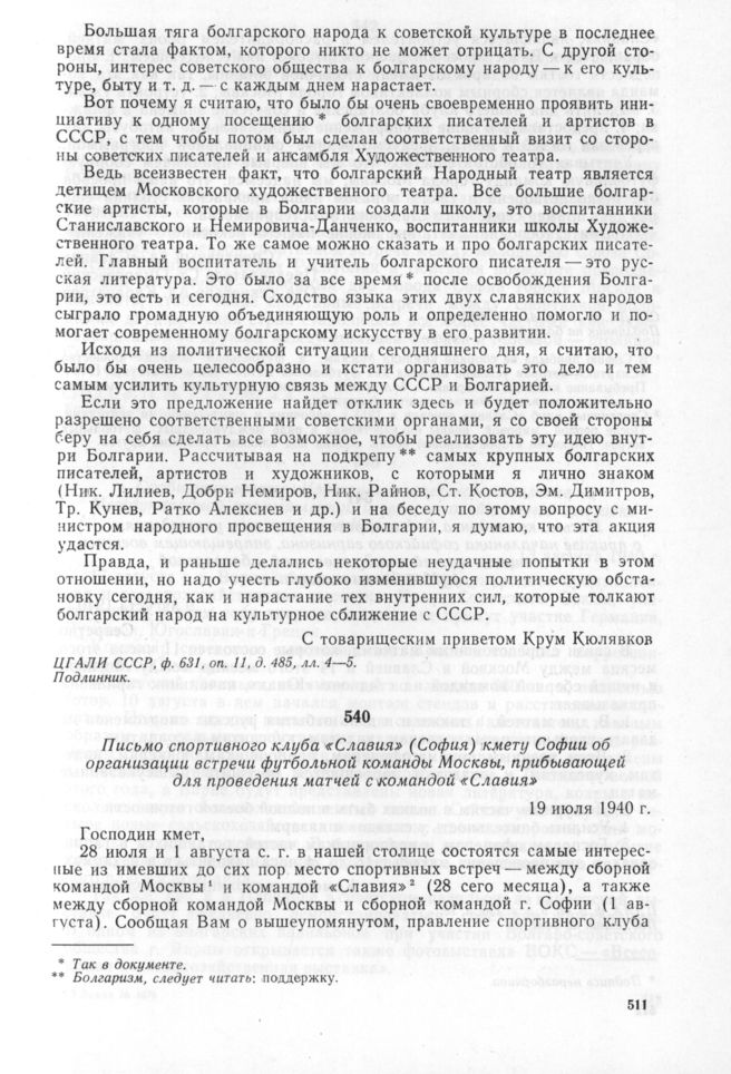 Письмо спортивного клуба «Славия» (София) кмету Софии об организации встречи футбольной команды Москвы, прибывающей для проведения матчей с командой «Славия». 19 июля 1940 г. // СГОДА, ф. 1к. оп. 4, а.е. 1087, л. 1. Подлинник на болг. яз