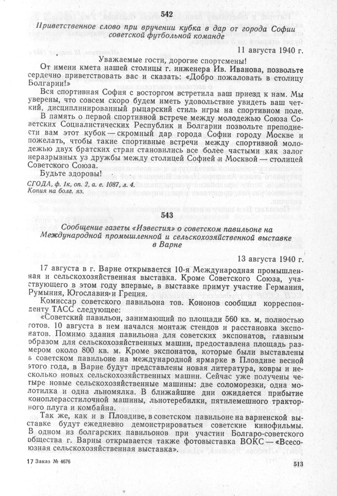 Сообщение газеты «Известия» о советском павильоне на Международной промышленной и сельскохозяйственной выставке в Варне. 13 августа 1940 г.